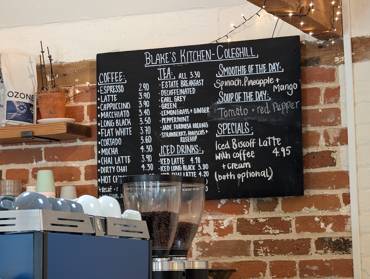 The menu at Blake’s Kitchen Coleshill features a selection of coffees, breakfast items, light meals, and snacks suitable for various times of the day including breakfast and casual dining. Visitors can choose from a variety of hot beverages such as cappuccino, macchiato, long black, and chai latte.